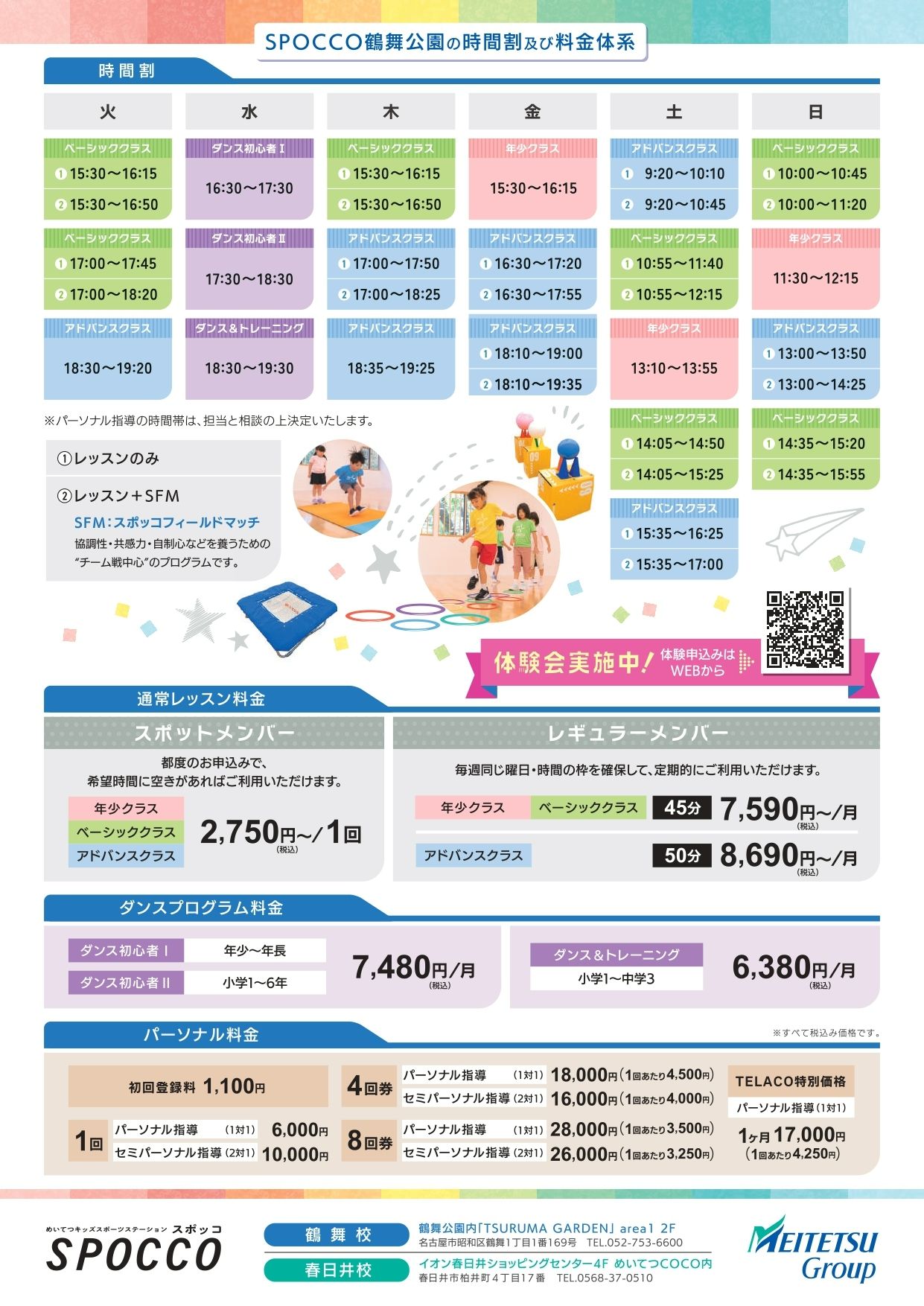 そんなSPOCCO鶴舞公園の時間割をいつでも見ることできるように載せさせていただきます!体験をご希望の方、振替先のご検討時などにぜひご活用ください!